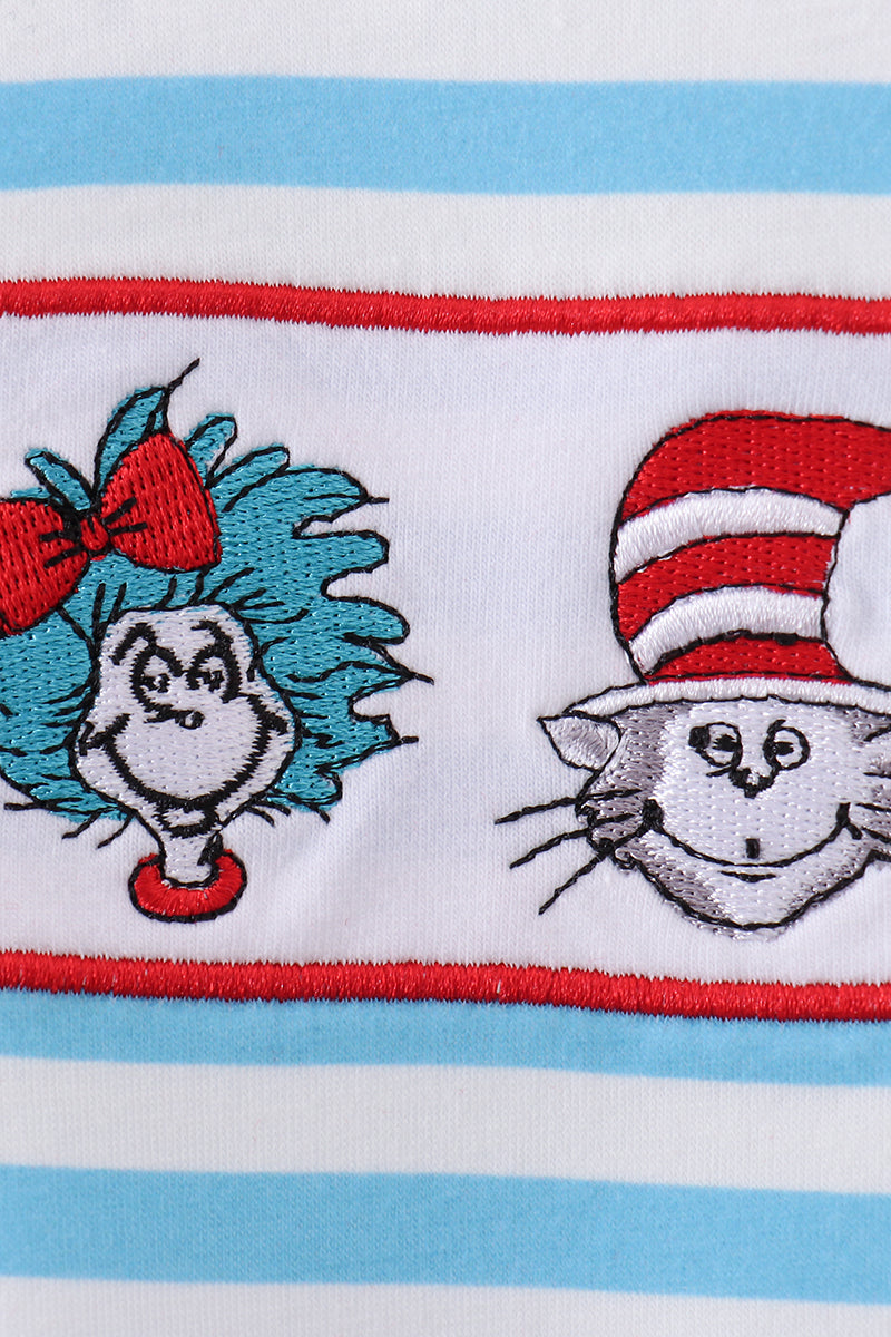 Blue character embroidery stripe ruffle romper