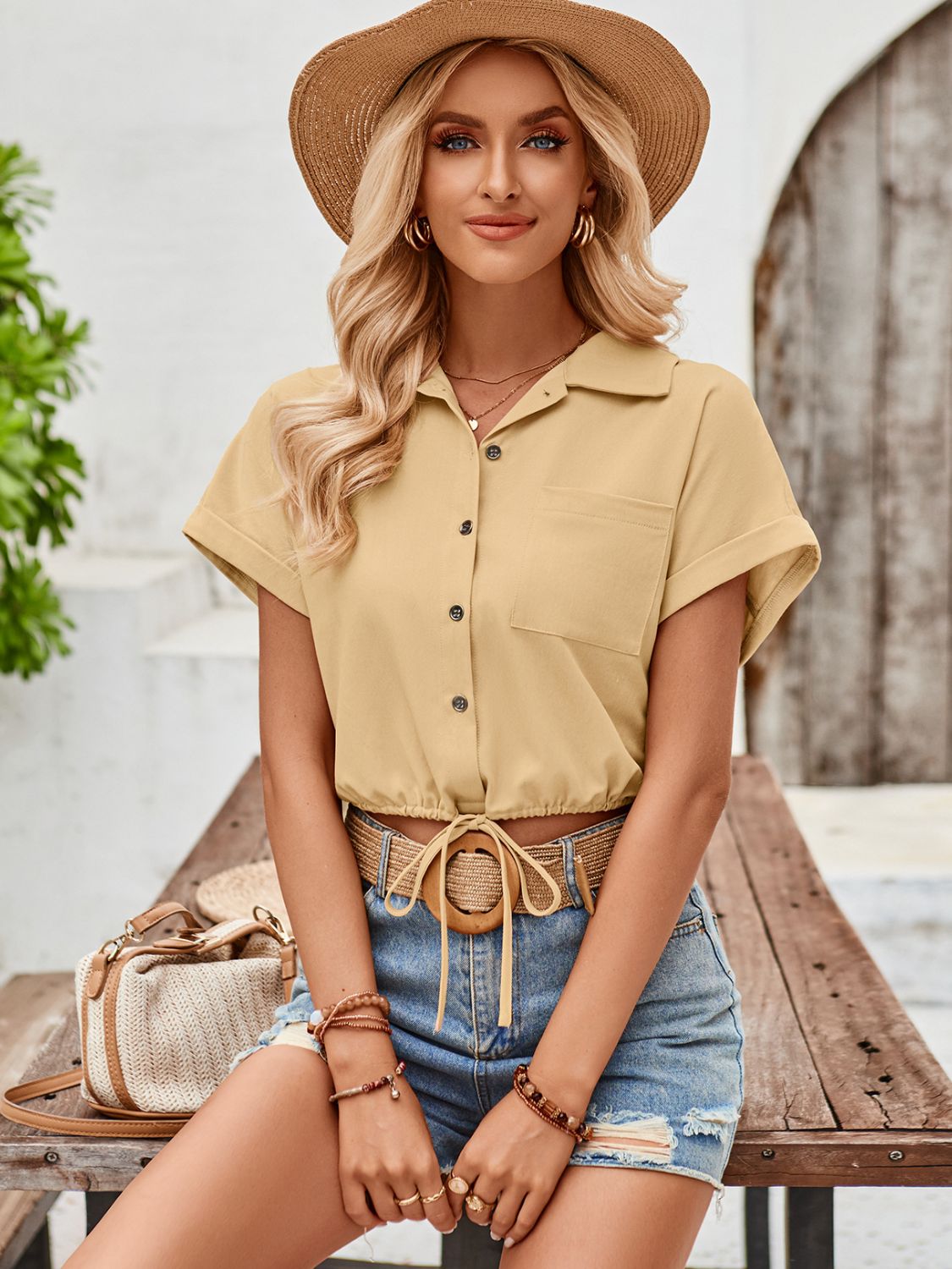 Drawstring Pocketed Collared Neck Short Sleeve...